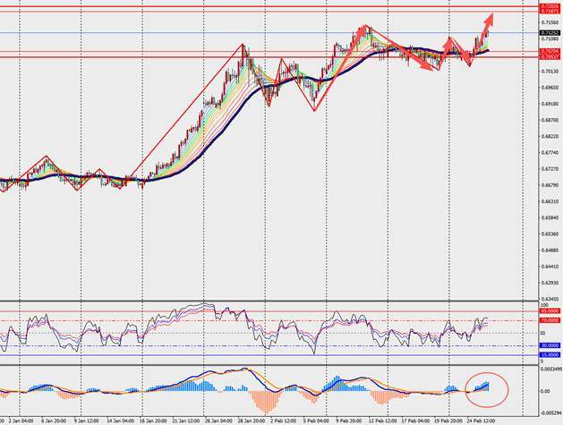 技术面:澳元兑美元H4级别震荡上行,并在48日多空分界线上方运行。另一方面,MACD双线和量能柱开始在零轴附近缩量。澳大利亚1月份核心通胀率强于预期,预示货币政策可能需要进一步收紧,这推动澳元走高。