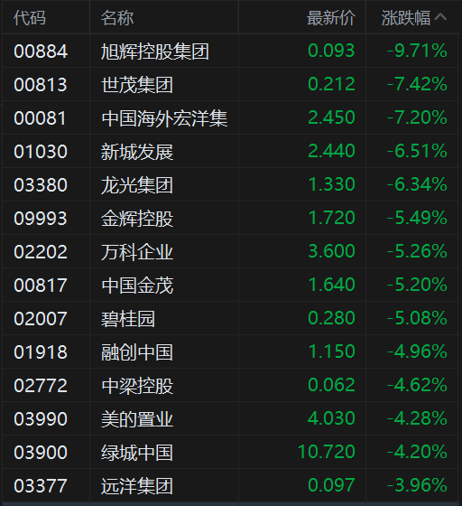 港股内房股全线下跌,旭辉控股集团跌近10%,世茂集团、中国海外宏洋集跌超7%,新城发展、龙光集团跌超6%,金辉控股、碧桂园、中国金茂跌超5%,融创中国、中梁控股、美的置业、绿城中国、远洋集团等跟跌。