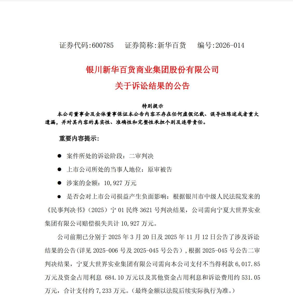 3月5日盘后,新华百货(600785)(SH600785)公告称已于当日收到银川市中级人民法院(以下简称银川中院)发来的二审《民事判决书》。终审判决显示,法院判决新华百货在判决生效30日内,赔偿大世界损失共计1.09亿元,并承担其他诉讼费用。