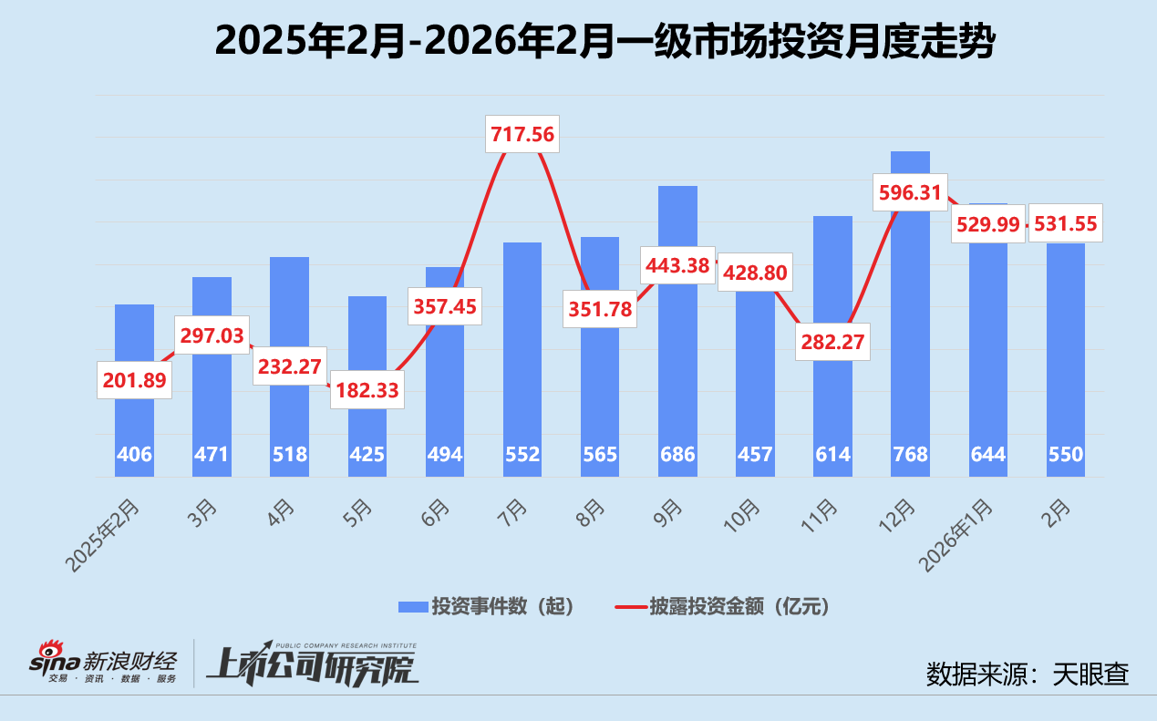 受春节假期影响,国内一级市场投资活跃度小幅回落。基于公开数据不完全统计,2月共发生550起股权投资事件,较1月缩水14.6%;披露投资金额总和约为531.55亿元,环比基本持平。对比2025年同期,两项指标分别增长35.5%、163.3%,带动平均单笔投资额达9664.56万元,同比近乎翻番,环比提升17.4%。