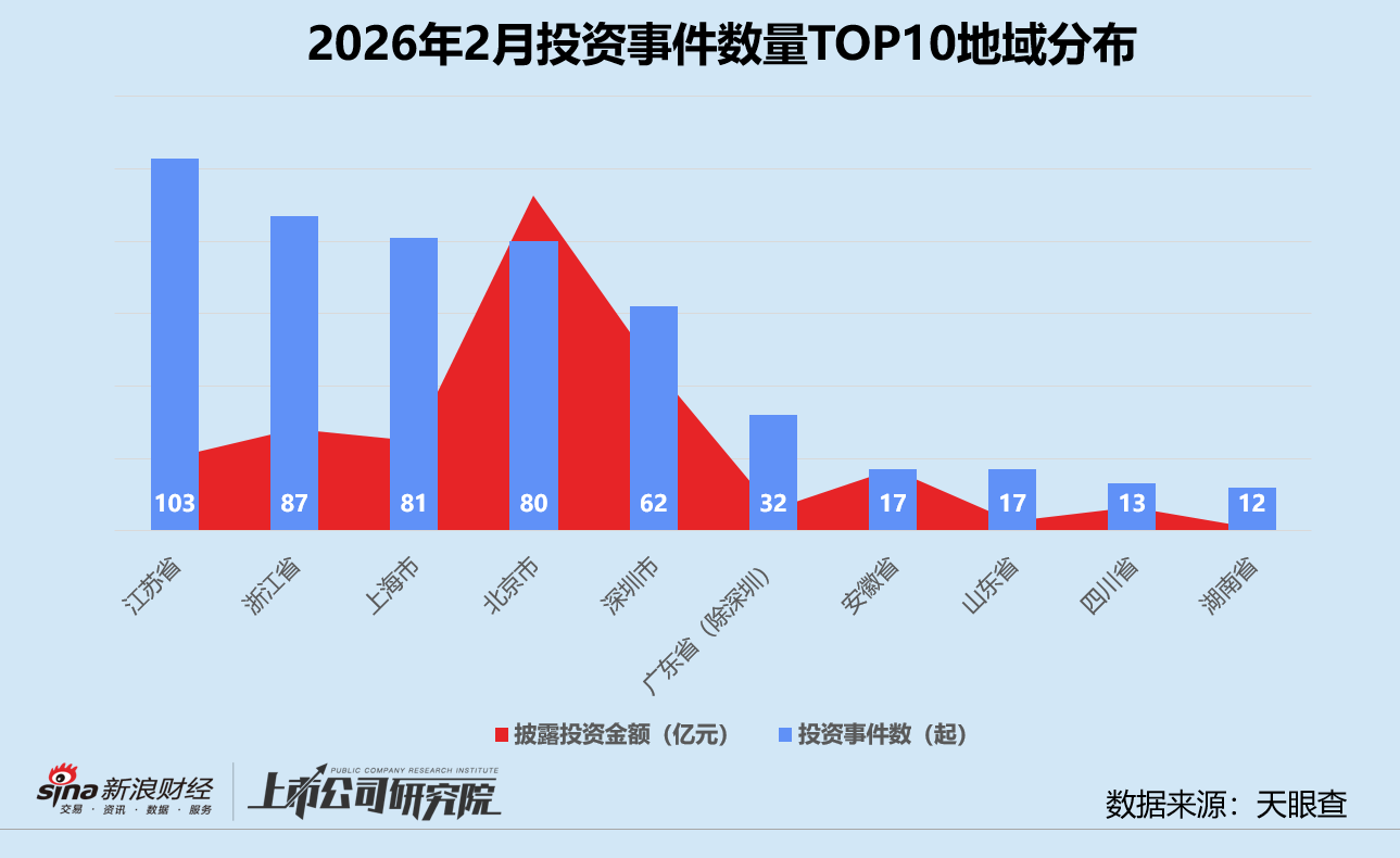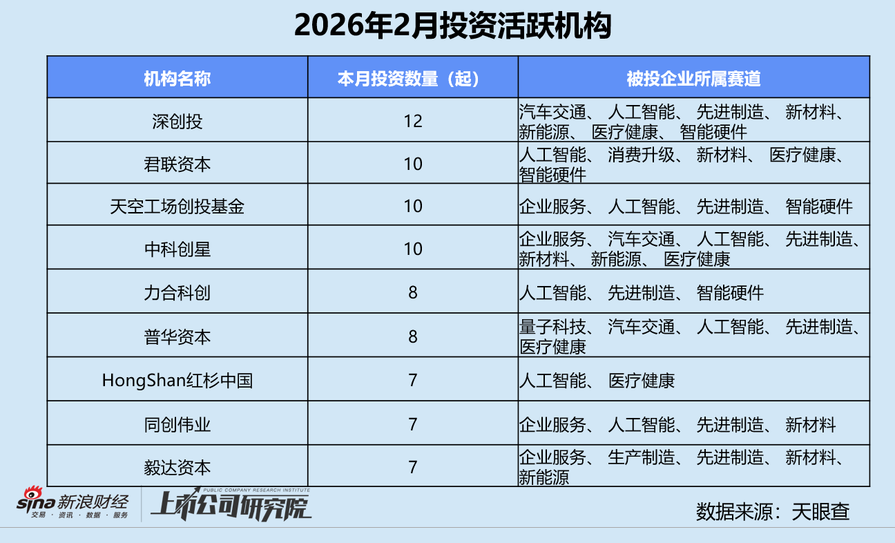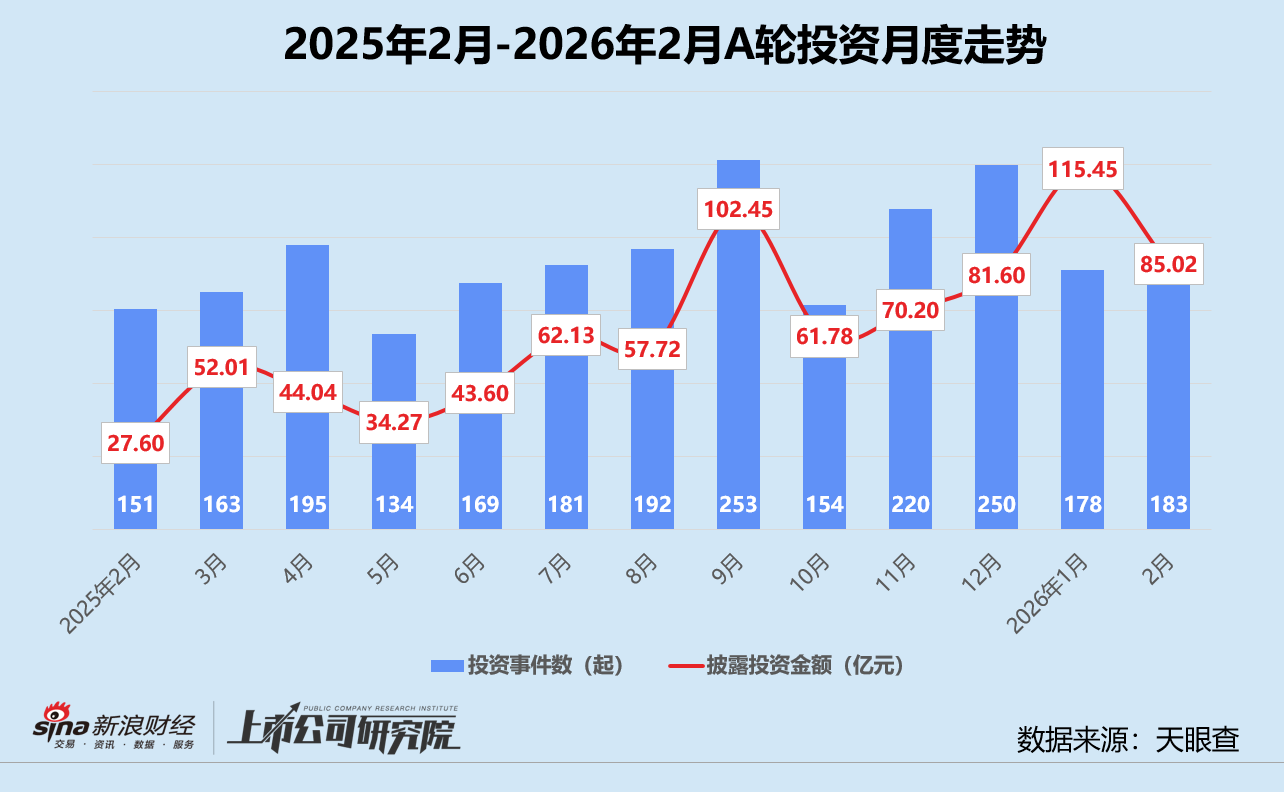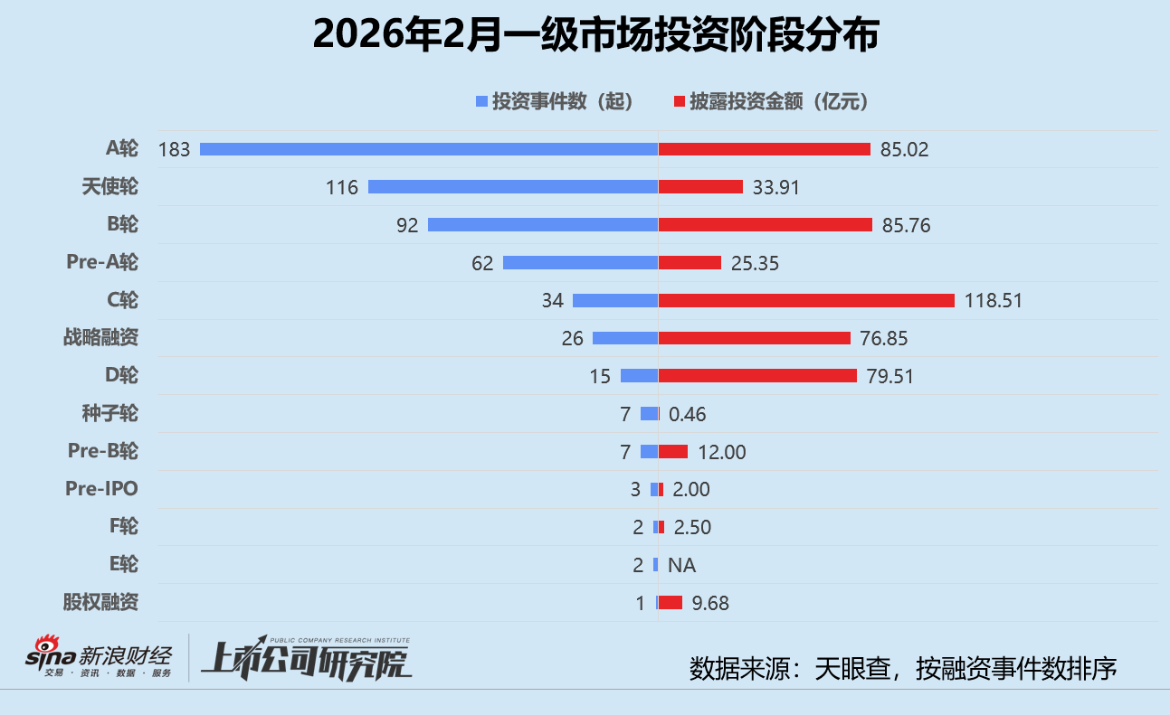 从阶段分布来看,早期阶段的种子轮、天使轮和Pre-A轮投资事件共有185起,约占事件总数的33.6%,明显高于2025年2月的28.8%,但较2026年1月下降近7个百分点。A轮投资事件数稳居榜首,约占投资事件总数三分之一,该指标环比增长5.6%,同比减少3.9%。大量人工智能、商业航天、量子计算等前沿科技初创企业涌入市场寻求融资,早期投资占比持续攀升。
