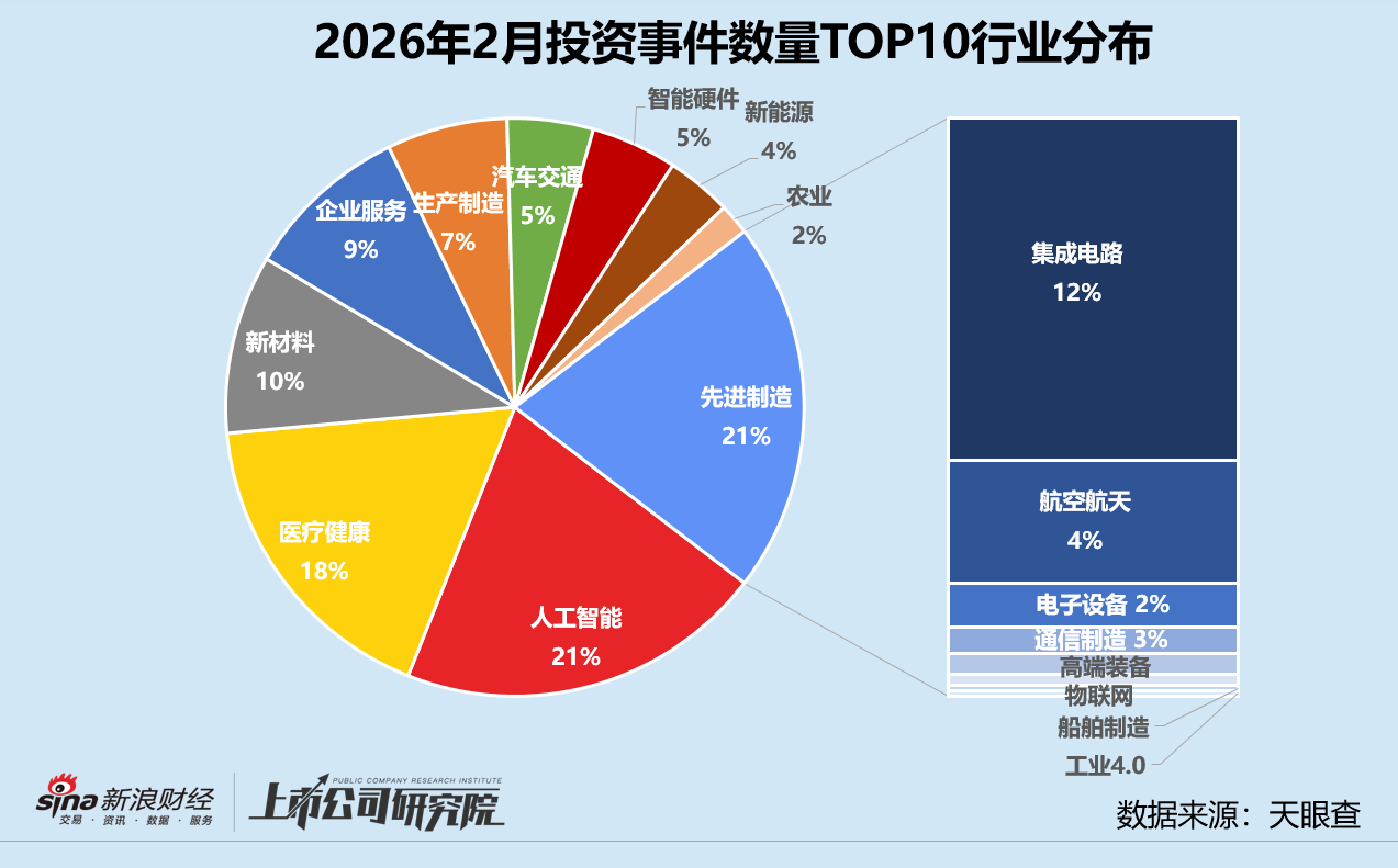 从行业分布来看,先进制造以微弱优势重回第一,本月共有108起股权投资事件,获投企业中约59.3%为集成电路公司,而2025年2月、2026年1月该指标分别为57.3%、52.9%;披露投资额合计161.67亿元,集成电路领域投资总额约占54.7%。商业航天领域展现出惊人的“吸金”能力,23家企业共获64.67亿元投资额,平均单笔投资额约为2.81亿元,同比、环比分别增长727.0%、304.9%。