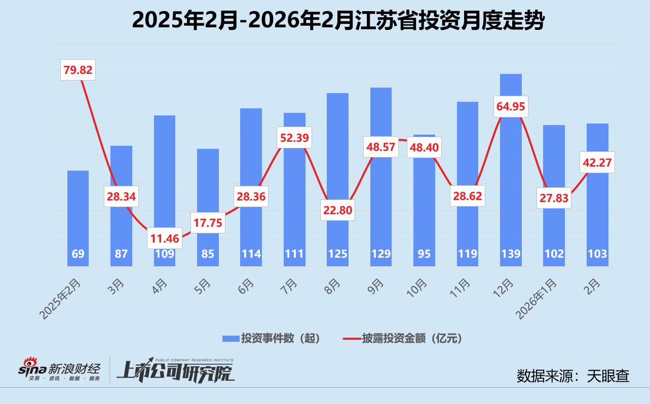 结合往期数据分析,江苏的投资表现长期保持高活跃度,但单笔投资额偏低,波动相对平稳。2025年除了2月和12月披露投资额较高,其余月份基本保持在10-50亿之间,与事件数量走势同步性较强。本月其投资事件数较2025年同期增加49.5%,披露投资金额却减少47.0%。与1月相比,其投资事件数和金额分别增长1.0%、51.9%。江苏地区平均单笔投资额约为4104.14万元,同比骤降64.5%,环比提高50.4%。