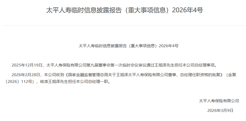 3月10日金融一线消息,太平人寿日前发布公告称,2025年12月19日,太平人寿保险有限公司第九届董事会第一次临时会议审议通过王旭泽先生担任本公司总经理事项。2026年2月28日,该公司收到《国家金融监督管理总局关于王旭泽太平人寿保险有限公司董事、总经理任职资格的批复》(金复〔2026〕112号),核准王旭泽担任总经理一职。