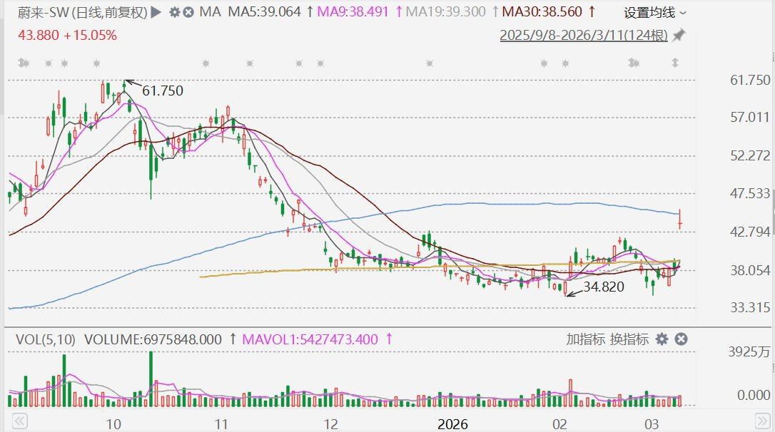 蔚来-SW(9866.HK)盘初大涨近20%,报45.6港元。消息面上,蔚来昨晚公布业绩显示,2025年第四季度经营利润为12.5亿元,实现公司首次季度盈利;总营收约346.5亿元,同比增长75.9%;现金储备459亿元,环比大幅增长近百亿元。