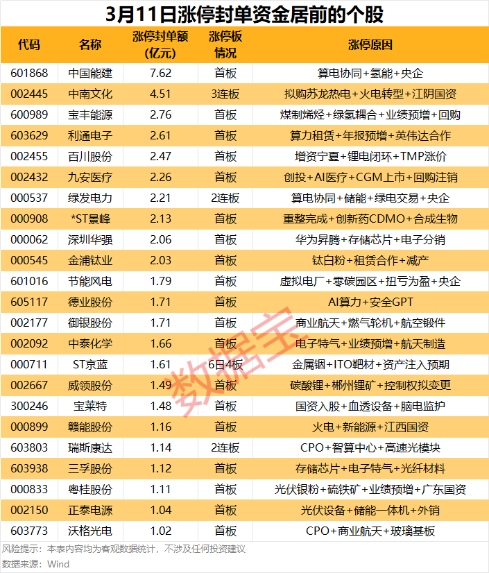 以封单金额计算,中国能建、中南文化、宝丰能源(600989)等涨停板封单资金最多,分别有7.62亿元、4.51亿元、2.76亿元。