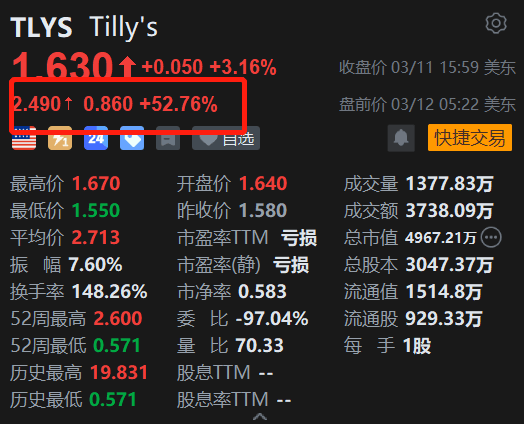 美股异动丨Tilly's盘前大涨约53% Q4业绩扭亏为盈、本季指引强劲