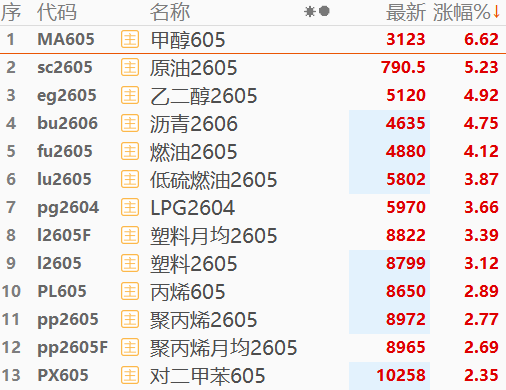 3月18日期货夜盘开盘,原油期货主力合约高开4.81%,随后快速拉升,一度涨超7%。此外,甲醇、燃油、沥青等油化相关期货涨幅居前。