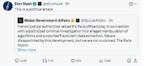 法国司法部门搜查X巴黎办公室,马斯克称这是“政治攻击”