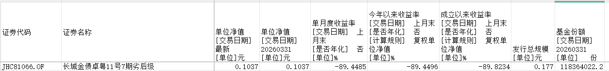 其中,截至2026年3月31日,长城金债卓粤11号7期劣后级(JHC81066.OF)其单位净值为0.1037元,3月单月度收益率为-89.4485%,今年前3个月收益率为-89.4496%,成立以来收益率为-89.8234%。