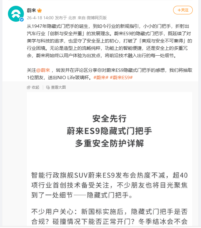 蔚来回应ES9仍用隐藏式门把手:完全合规