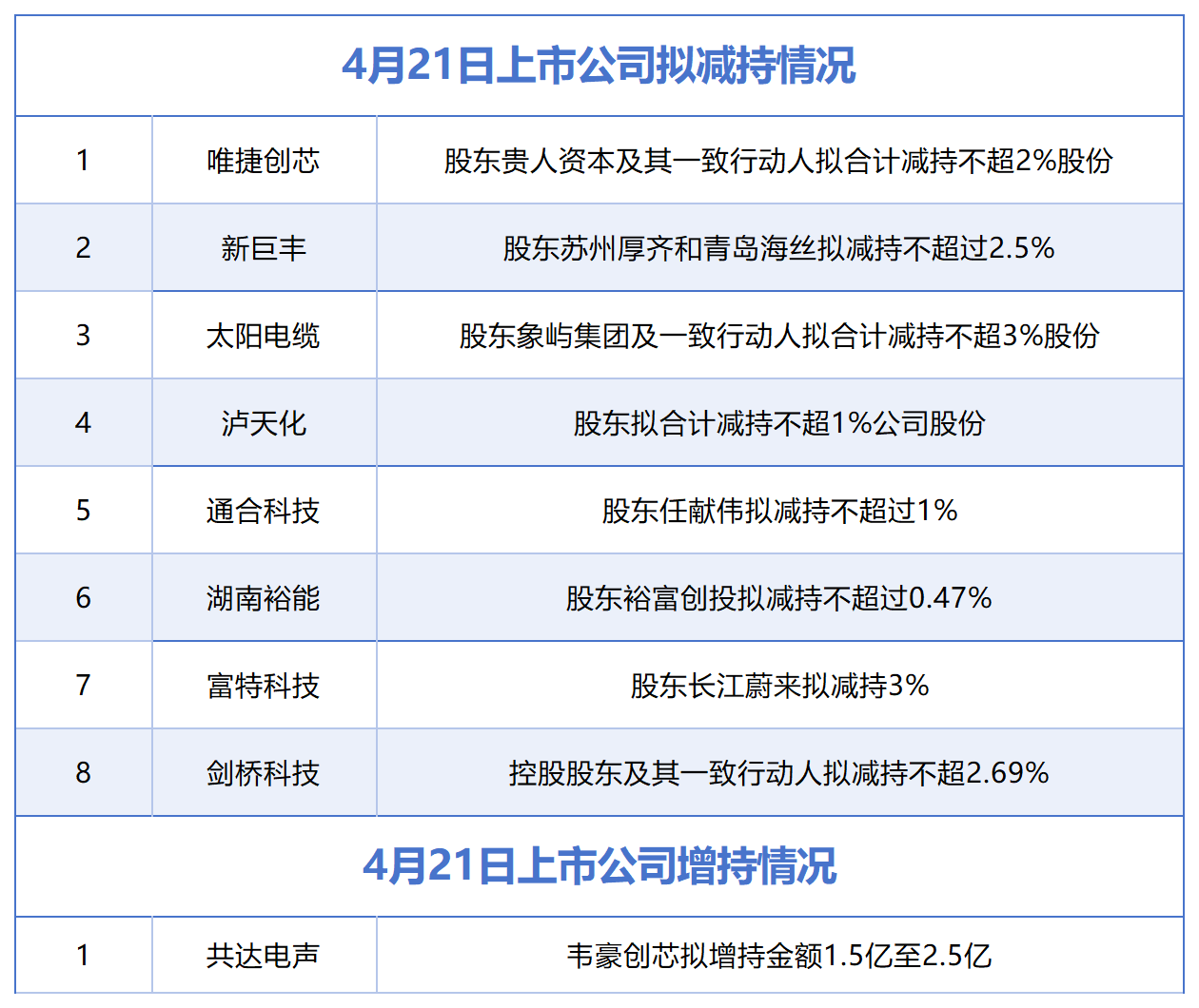据统计,4月21日,盘后,唯捷创芯、新巨丰、太阳电缆、泸天化、富特科技、湖南裕能、通合科技、剑桥科技在内的8家A股上市公司披露拟减持情况。共达电声披露增持情况。