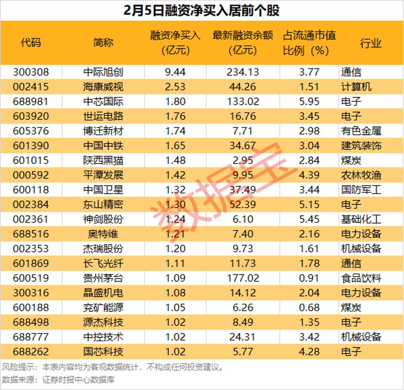 中际旭创融资净买入额居首,当日净买入9.44亿元;其次是海康威视(002415)、中芯国际,融资净买入金额分别为2.53亿元、1.80亿元。融资净买入金额居前的还有世运电路(603920)、博迁新材、中国中铁(601390)等。