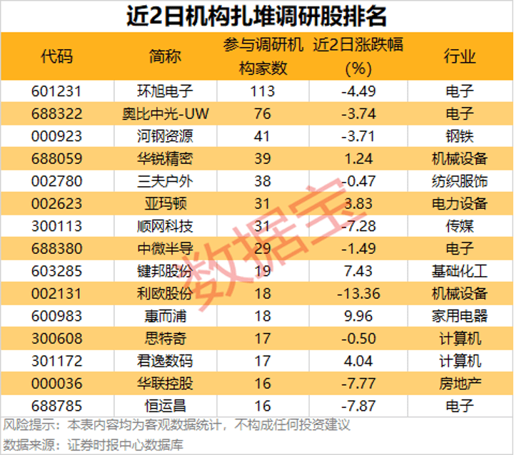 环旭电子最受关注,有113家机构调研;其次是奥比中光-UW,获76家机构调研。