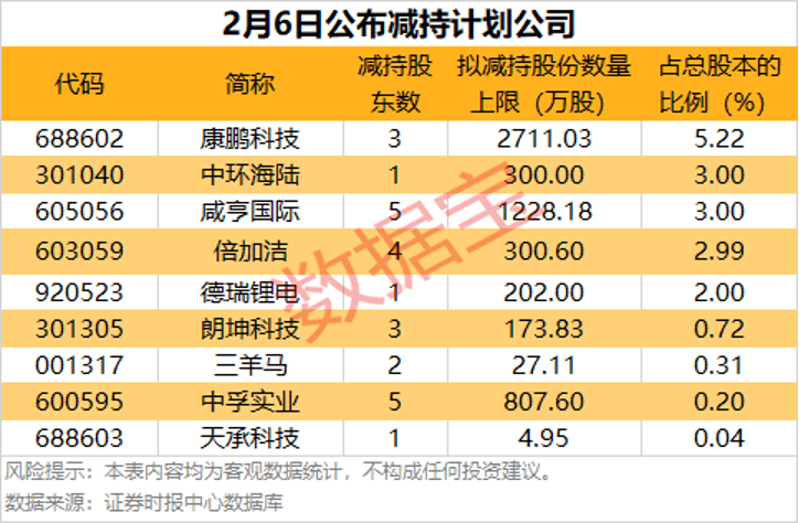 今日共9家公司公告减持计划,拟减持比例居前的有康鹏科技、中环海陆、咸亨国际等。