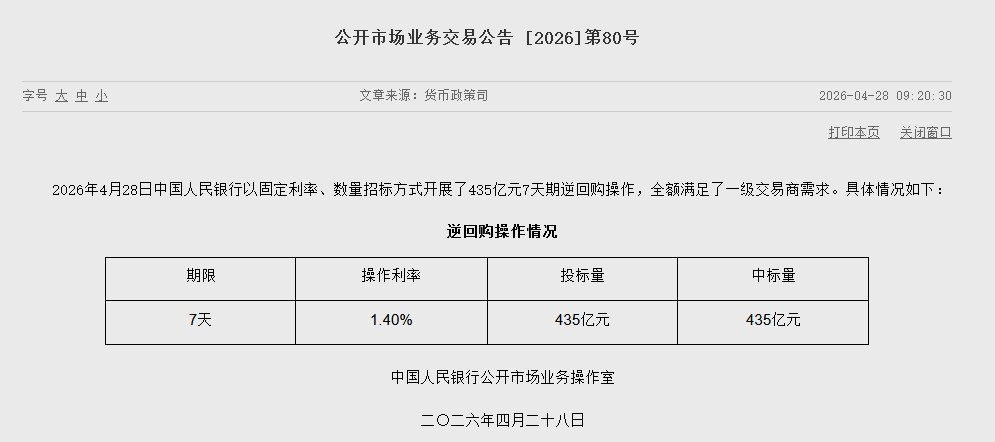 4月28日金融一线消息,据央行发布,2026年4月28日中国人民银行以固定利率、数量招标方式开展了435亿元7天期逆回购操作,全额满足了一级交易商需求。