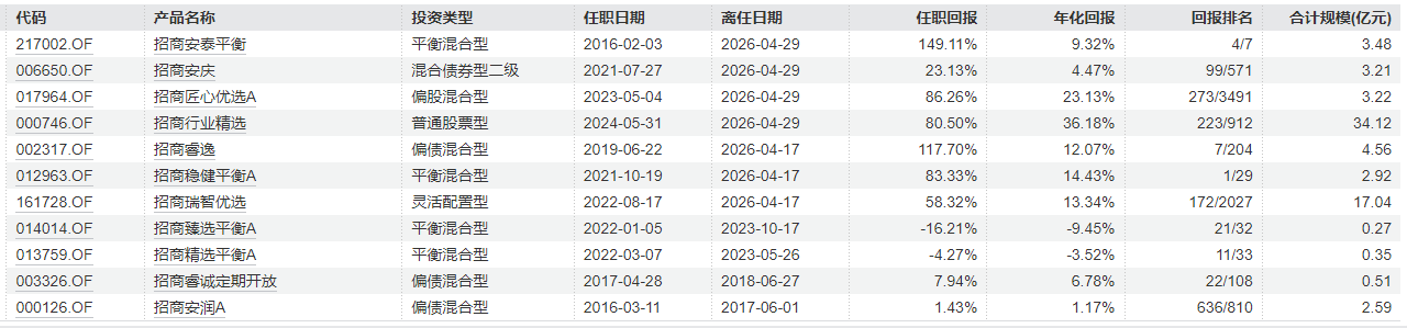 公开资料显示,李崟职业生涯经历银行、基金、财务公司等多个阶段,2015年12月正式加入招商基金。截至离任前,其公募基金经理年限已超10年,一季度末管理规模约69.91亿元。旗下管理的多只平衡型产品在业内中长期业绩出众,招商稳健平衡、招商安泰平衡、招商匠心优选A等任职回报在同期同类型产品中居前甚至排在首位。其中,管理时间最长的招商睿逸累计任职近7年,任职回报高达118%,年化收益率12%;招商安泰平衡与招商匠心优选A任期回报分别为149.11%、86.26%,跑赢业绩比较基准。Wind数据显示,截至4月28日,李崟过往管理产品年化回报达12.13%,远超同期沪深300指数表现。据业内消息,李崟此次卸任后将离开招商基金,下一站或仍在公募基金发展。