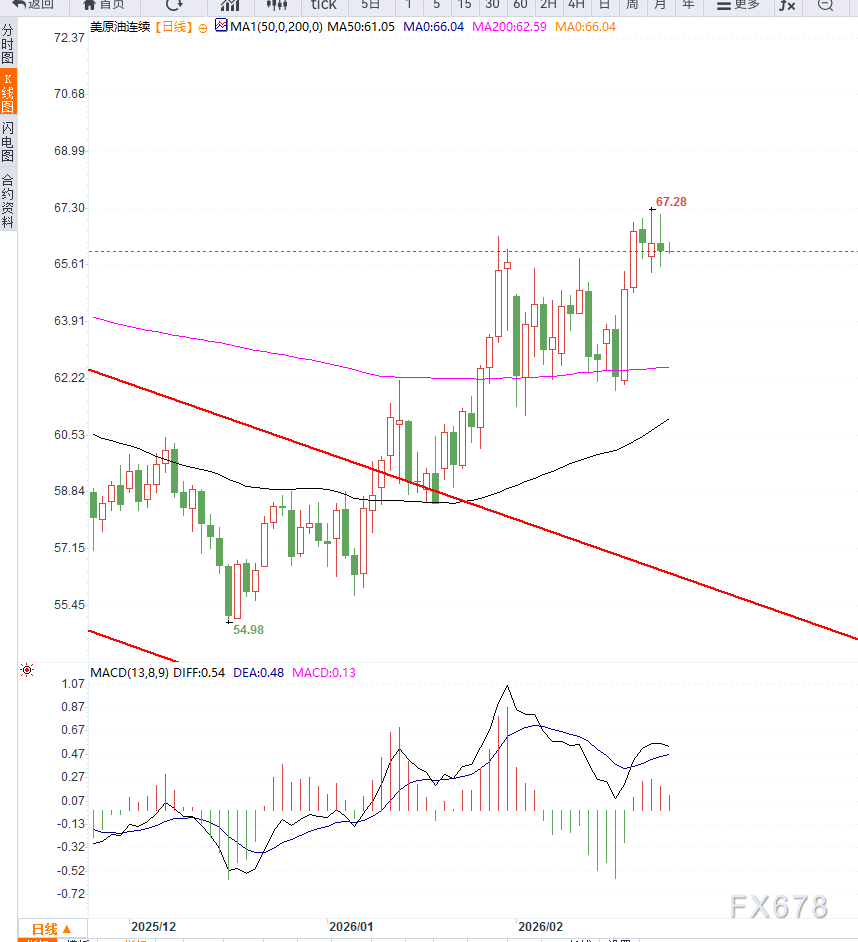 但随着伊朗方面释放愿意推进谈判的信号,局势出现缓和迹象。核谈判预计将在日内瓦恢复,美方代表Steve Witkoff与Jared Kushner将再次与伊朗外长会面。伊朗副外长公开表示,德黑兰准备采取必要步骤以达成协议,这在一定程度上削弱了市场对冲突升级的担忧。“若霍尔木兹海峡运输受阻,将影响约2000万桶/日的供应,油价波动可能难以预测。”――PVM Oil Associates不过,风险并未完全消失。美国仍在强化地区军事存在,市场对谈判结果保持谨慎。当前油价回落,并不意味着地缘风险完全解除,而是对极端情景概率的重新评估。从基本面看,供应端压力仍然存在。OPEC+及美洲产油国持续增产,全球库存水平回升,而需求增长节奏偏缓。OPEC+下月会议可能继续讨论扩大产量配额,显示主要产油国仍在争夺市场份额。在供需结构偏宽松的背景下,油价缺乏持续大幅上行的坚实支撑。当前市场逻辑呈现出“双重博弈”特征:一方面是外交进展压低风险溢价,另一方面是供给增长对价格形成中期压力。两股力量交织,使油价进入震荡回调阶段。从日线走势来看,WTI在此前冲高后形成阶段性顶部,近期连续三根阴线显示空头动能增强。价格已跌破短期均线支撑,技术形态转为偏弱。下方第一支撑位65.20美元附近,第二支撑位:63.80美元。上方第一阻力位:67.50美元,第二阻力位:70.00美元。若谈判继续释放积极信号,油价可能进一步测试63美元附近区域;若外交进程受阻或局势再度紧张,则油价有望迅速收复67美元并向70美元发起挑战。整体来看,技术结构已由此前的风险驱动上涨转向震荡回落格局,短期趋势偏空,但波动率可能维持高位。