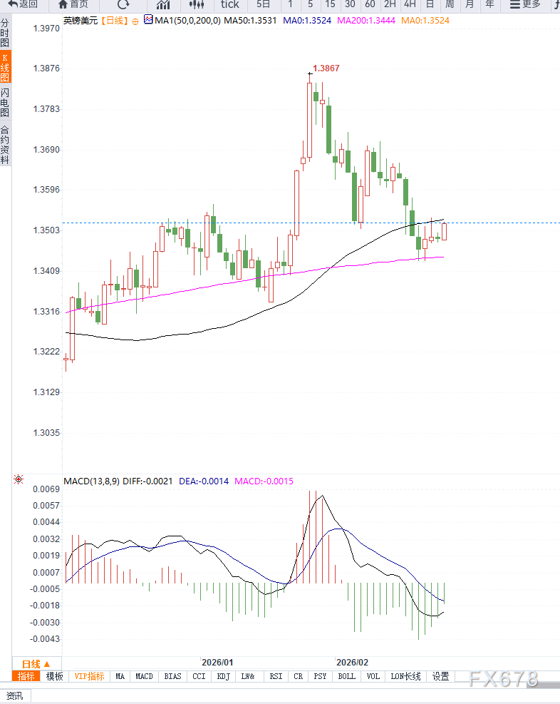 从技术结构看,GBP/USD正处于短期上升趋势结构中运行。1.3520附近为当前多空平衡区域,价格已连续多日维持高位整理。上方关键阻力位位于1.3550附近,该区域为前期波段高点密集区。