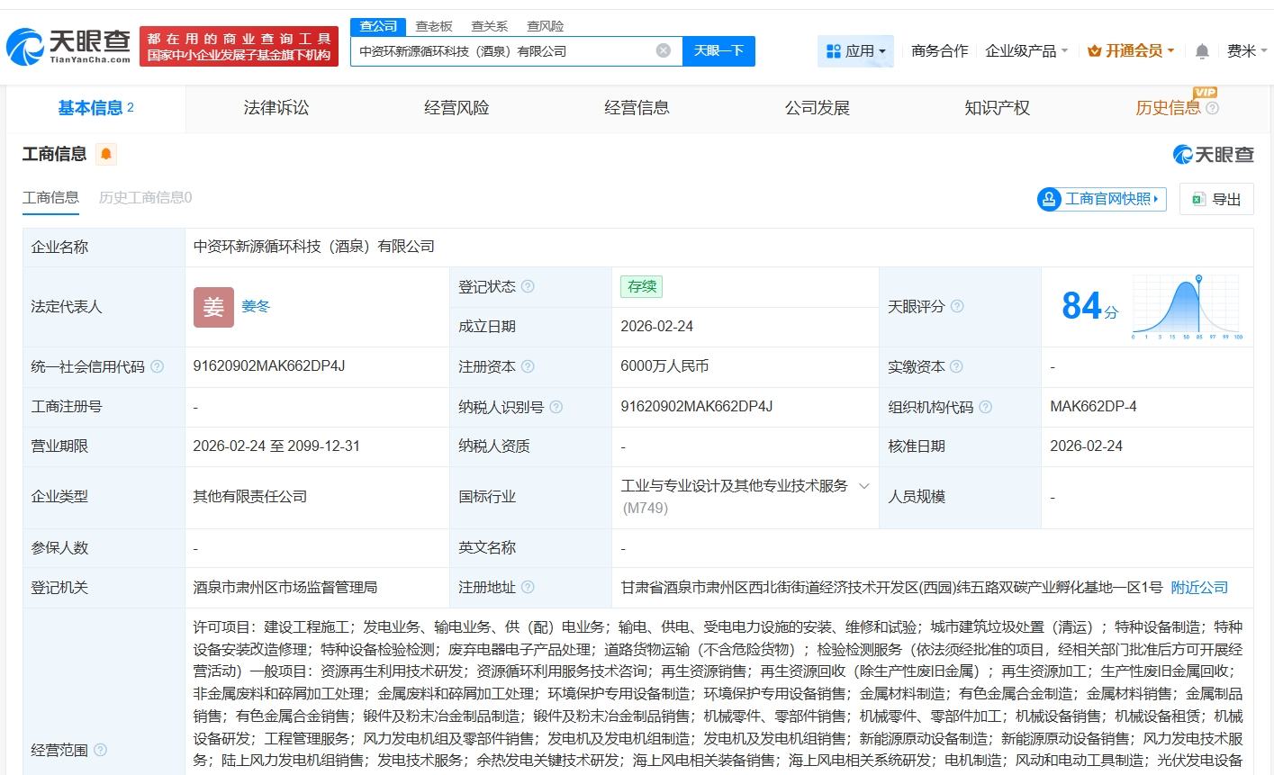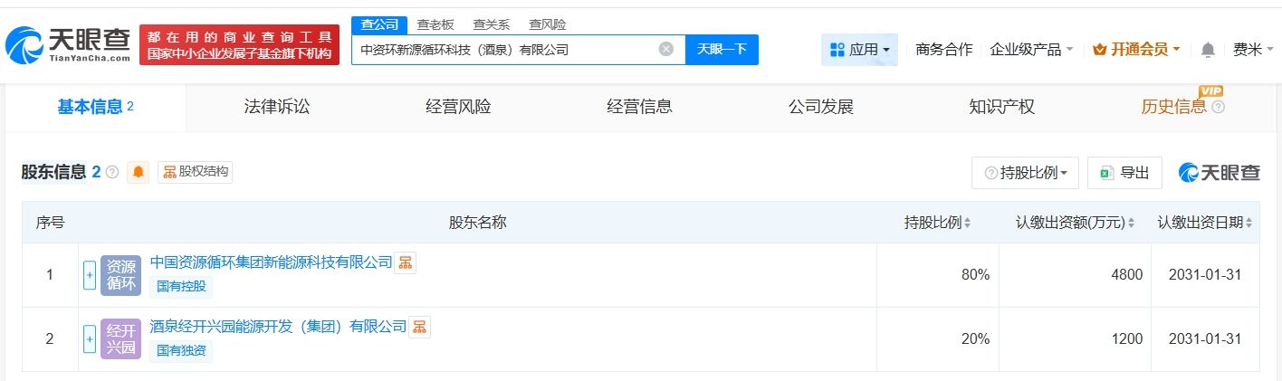 天眼查App显示,近日,中资环新源循环科技(酒泉)有限公司成立,法定代表人为姜冬,注册资本6000万人民币,经营范围包括建设工程施工、特种设备制造、特种设备安装改造修理等,由中国资源循环集团新能源科技有限公司、酒泉经开兴园能源开发(集团)有限公司共同持股。