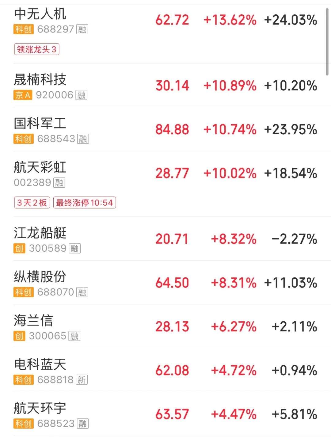 军工板块逆势爆发,无人机、船舶方向领涨,航天彩虹3天2板,中无人机涨超10%。