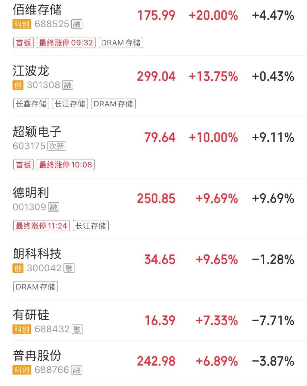 存储芯片板块大涨,佰维存储、德明利涨停。