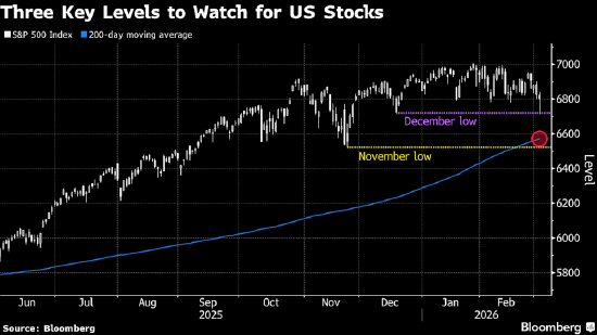 标普500指数周二一度大跌2.5%,至6710.42点,短暂跌破12月低点,最终收跌约0.9%。此次下跌还令该指数跌破100日均线,这一水平在过去一年大部分时间里都是强劲支撑。