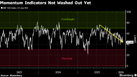 动能指标同样释放出谨慎信号。标普500的相对强弱指数(RSI)数月来持续下行,目前在43附近徘徊。尽管仍高于30这一传统超卖阈值,但这意味着在市场情绪触底前,股价仍有进一步下跌空间。