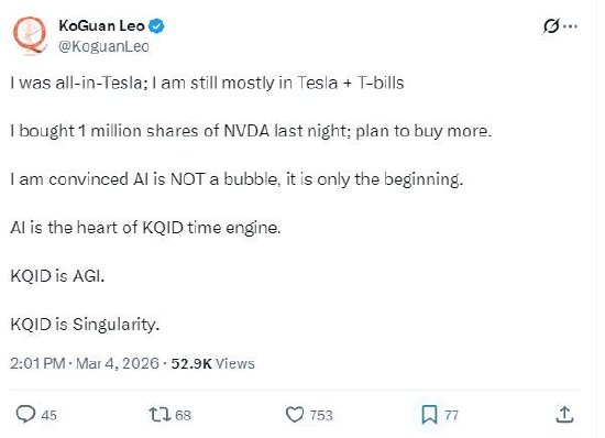 特斯拉投资者廖凯原宣布买入100万股英伟达股票:“我坚信人工智能没有泡沫”