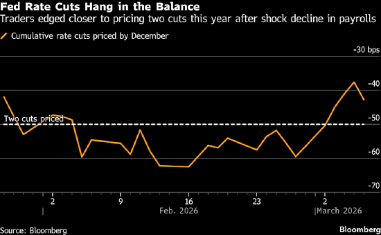 利率互换数据显示,受中东冲突扩大影响,交易员本周重新调整了对美联储的政策预期。他们目前押注,到今年年底,美国政策制定者将累计降息36个基点,下次降息预计在9月。而一周前,市场预期2026年降息幅度为60个基点。