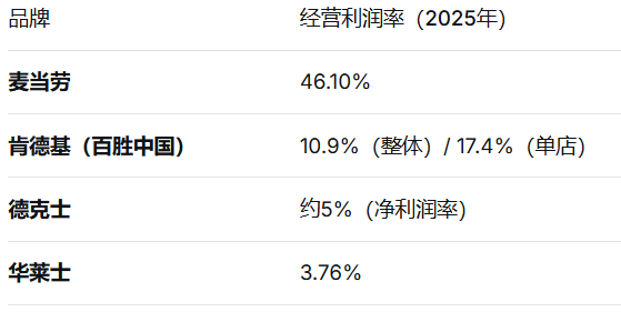 麦当劳的利润率是华莱士的12倍。肯德基单店利润率是华莱士的4.6倍。就连同处下沉市场、同样面临困境的德克士,净利润率也略高于华莱士。