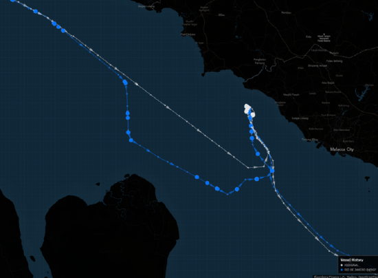 Kisogawa号(白色)于上周末在马来西亚西海岸附近从Rio De Janeiro Energy接收了运往日本的穆尔班原油。