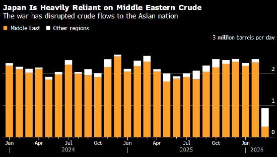 船舶追踪数据显示,自冲突爆发以来,仅有两艘日本油轮直接从中东装载原油,且均发生在3月1日。去年短暂冲突期间,首批要求船队规避整个波斯湾地区的船东就包括日本船东。