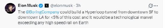 马斯克在X上回应网友转发的相关报道称:“如果由Boring Company建造一条从旧金山市中心到洛杉矶市中心的超级高铁隧道,成本将不到这一数字的5%,而且这将是一项超越地球上任何高速铁路的技术奇迹。”