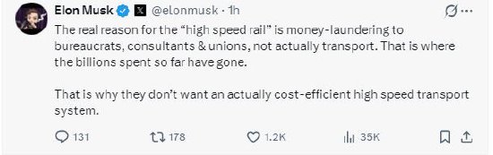 马斯克回应称:“这条‘高铁’的真正目的并非为了交通,而是为了给官僚、顾问和工会洗钱。迄今为止投入大量资金都用在了这些方面。这就是为什么他们不想要一个真正经济高效的高速交通系统。”