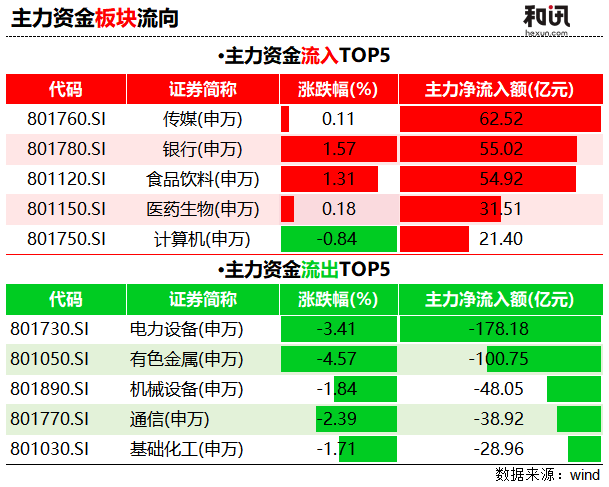电力设备遭主力资金抛售近180亿!资金涌入传媒银行等板块