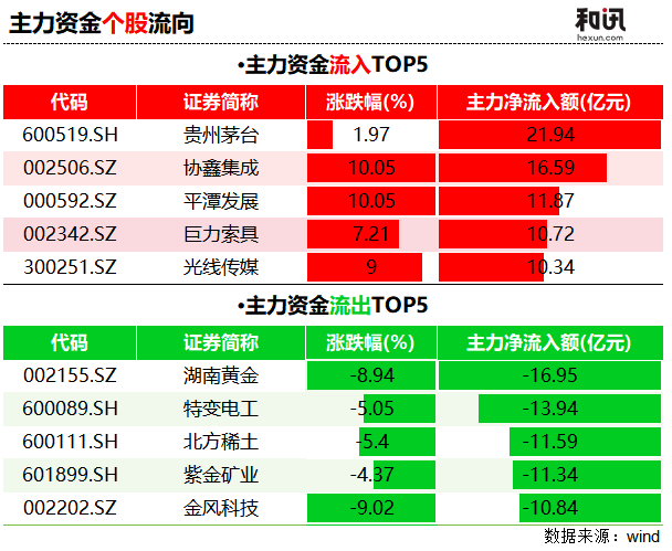 主力资金净流入前五个股中,贵州茅台作为消费龙头,获得21.94亿元主力资金净流入,涨幅1.97%。协鑫集成与平潭发展双双以涨停板收盘,分别获得16.59亿元和11.87亿元资金流入。而湖南黄金、北方稀土、紫金矿业等资源类个股集体遭遇资金撤离。
