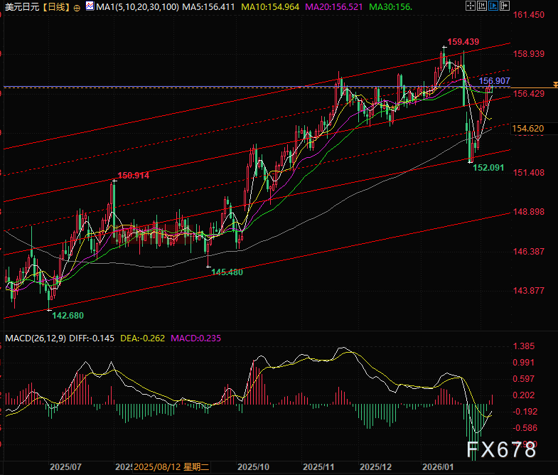美元兑日元近期延续偏强态势,但上行节奏始终受限,整体仍处于震荡格局。